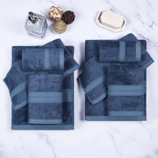 Elevate your bathroom decor with the Rayon From Bamboo Cotton Blend 8 Piece Bath Towel Set. Crafted from a blend of bamboo and cotton for comfort and durability, ย these silky-soft bamboo bath towels provide a versatile absorption, perfect for the shower, bath, or beach. The pattern is a unique solid color towel with a coordinating border that will match with any Modern, Classic, Traditional, or Contemporary bathroom.ย