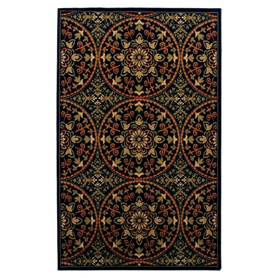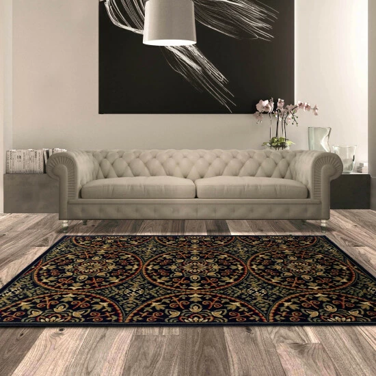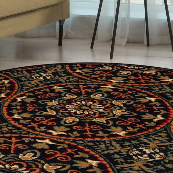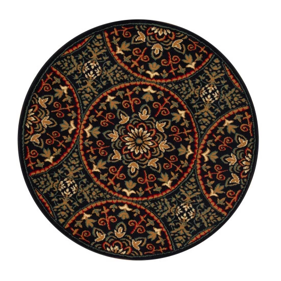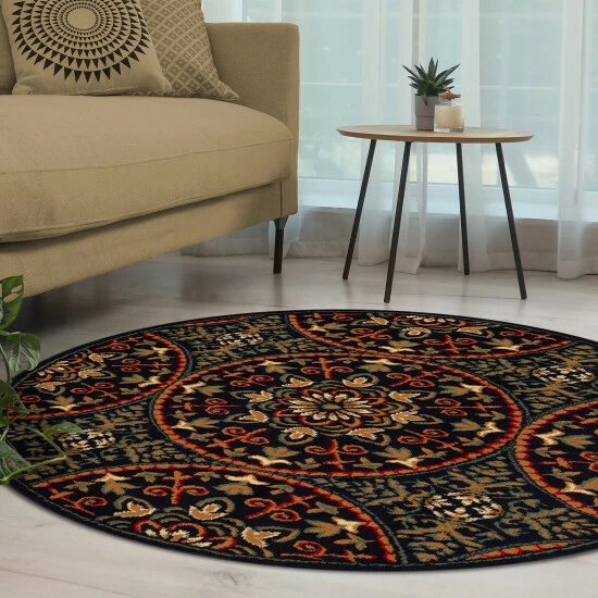 The Abstract Geometric Medallion Traditional Floral Power-Loomed Indoor Area Rug is the perfect addition to your eclectic or modern interior. Well-made with premium, 100% Polypropylene fibers and a soft 0.31″ pile height, this rug can handle high-traffic areas of your home while remaining cozy underfoot. This charming rug features a circular floral design in lively colors displayed over a rich, black foundation.Β