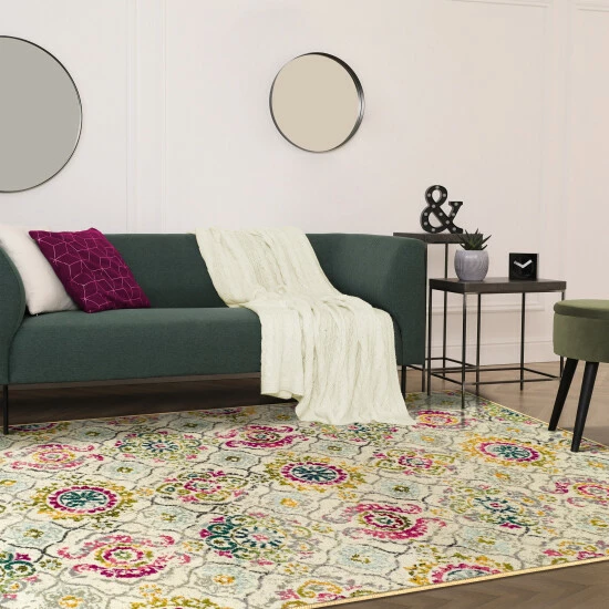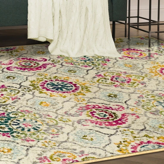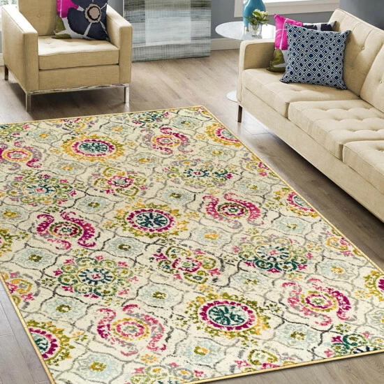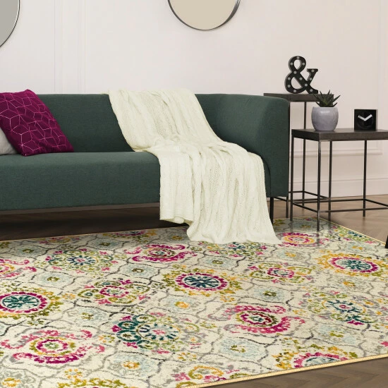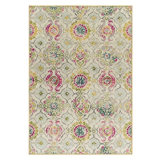 Add a colorful flair to your home with the Alyzia Area Rug. Well-made with quality, 100-percent Polypropylene fibers and a 0.39-inch pile height, this rug can handle high-traffic areas of your home while remaining soft and long-lasting. Add warmth and elegance to your space with this modern design. The warm sun-washed colors with a distinctive, delicate floral damask pattern are alternately arranged over an ivory-beige trellis frame to add a designer touch to your decor. The bright, multi-hued palette of pink, amber-gold, yellow, and teal blue is certain to add depth and texture to your interior. Remove spills immediately. If liquid spills over, blot with clean, undyed cloth by pressing firmly around the spill to absorb as much as possible. For hard to remove stains, professional rug cleaning is recommended.Β