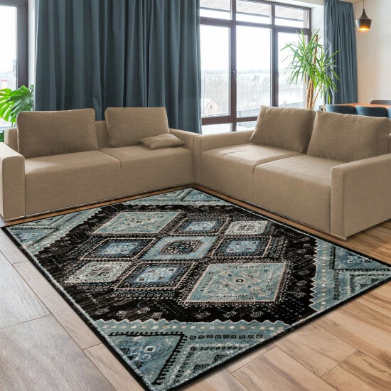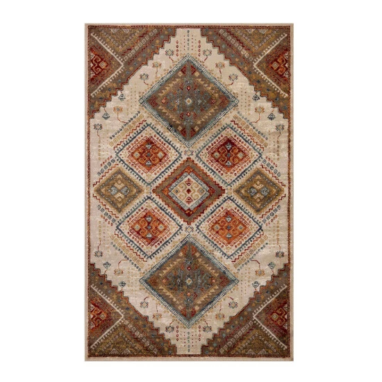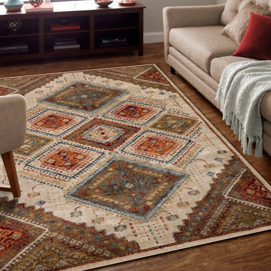 ο»ΏJocelyn Bohemian Geometric Diamonds Indoor Area Rug. The Southwestern-inspired style of the Jocelyn Bohemian Rustic Traditional Geometric Indoor Area Rug by Miranda Haus will instantly add warmth and charm to your home. The beautiful geometric diamond pattern of this rug will coordinate with any modern farmhouse, bohemian, and rustic interior. Crafted from long-lasting 100-percent Polypropylene fibers, this area rug cleans easily, can easily fit under most doors, and allows chairs sitting atop this rug to slide easily. The well-made jute backing makes this rug a durable option for homes with children and pets.