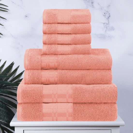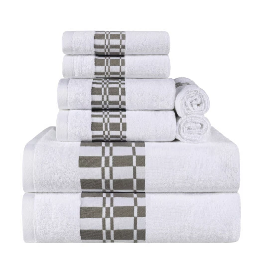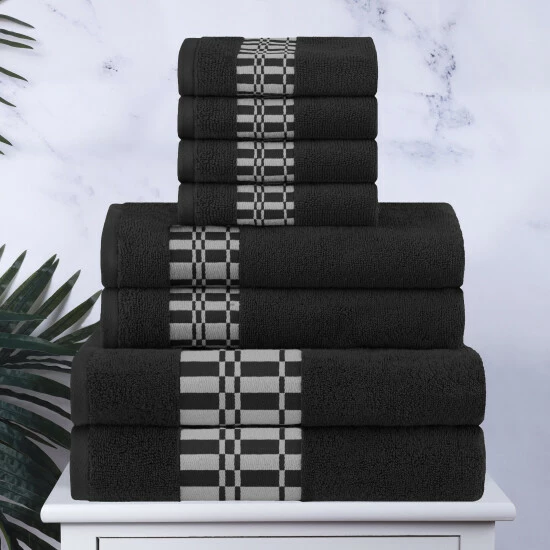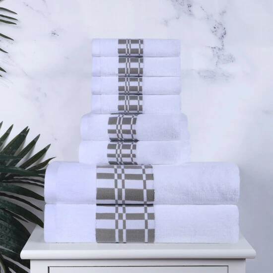 The Cotton 8 Piece Bathroom Towel Set with Geometric Border by Miranda Haus will tie your bathroom style together. The length and strength of premium Cotton makes this towel naturally strong and soft, with an ultra-absorbent design. For comfort and durability, each towel provides versatile absorption. This coordinated set is available in a variety of colors to match your bathroom decor.Β