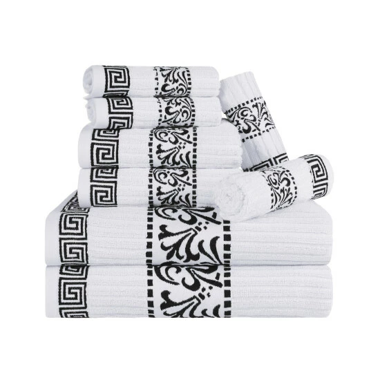 Redecorate your bathroom seamlessly with the Cotton 8 Piece Traditional Greek Key Trim Bathroom Towel Set by Miranda Haus. The length and strength of premium Cotton makes this towel naturally strong and soft, with an ultra-absorbent design. For comfort and durability, each towel provides versatile absorption. These enchanting towels Β are available in a variety of colors to match your unique bathroom decor.Β