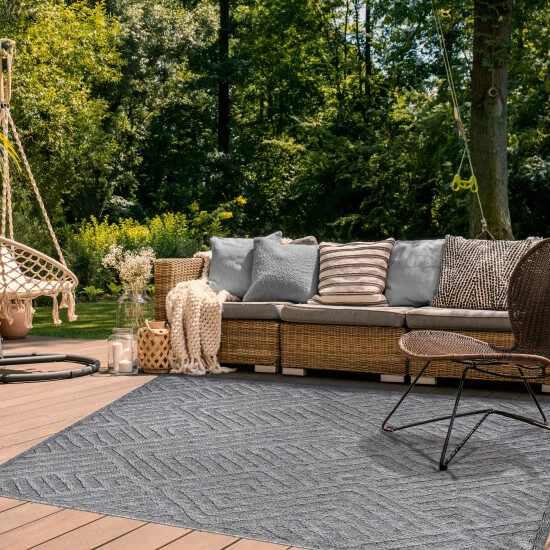 Complete the look of any indoor or outdoor area with our Marlow Modern Geometric Polypropylene Indoor/Outdoor Area Rug. The family-friendly 100-percent Polypropylene construction can handle some of your most high-traffic areas. This free-form geometric line pattern creates a mesmerizing design that showcases a varied high-low loop pile height to give this rug a carved appearance and bring visual interest and a texture-rich feel to this contemporary pattern. This piece boasts a 0.24-rug thickness at its highest that cleans easily, can fit under most doors and allows chairs sitting atop this rug to slide easily. Crafted to weather the elements while remaining soft and long-lasting, this lovely rug is sure to add style to your patio, deck, or any indoor living space.Β