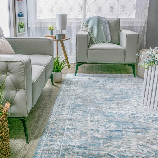 Relaxed elegance will fill the room when you display the Ohanna Vintage Damask Indoor Area Rug. The refined damask pattern adds character and charm to your interiors while the contemporary palette and geometric border offer a tailored finish to this symmetrical design. The extra low 0.11-inch pile height is easy to clean while being sturdy and durable enough to handle some of your most high-traffic indoor areas such as kitchens, mudrooms, basements, and entryways. The long-lasting 100-percent Polyester construction combines subtle sheen and a velvety soft underfoot to lend a calming look and feel that will blend into any home dΓ©cor.