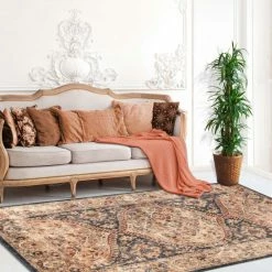 The one-of-a-kind gorgeous, elegant pattern of the Sibylla Area Rug from Miranda Haus will instantly elevate your living space. The ornamental design is featured in an intense beige and dark blue color palette that is finished with a detailed border. Woven and crafted from 100-percent polypropylene for strength and durability, the 11mm pile height has an incredibly plush feeling underfoot that can withstand everyday use. This altogether practical, durable, and the low-maintenance rug is anti-static, fire retardant, hydrophobic, and features a jute backing. This area rug is a desirable option if you are looking for outstanding value at an affordable price, which can only be found at Superior.
