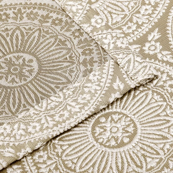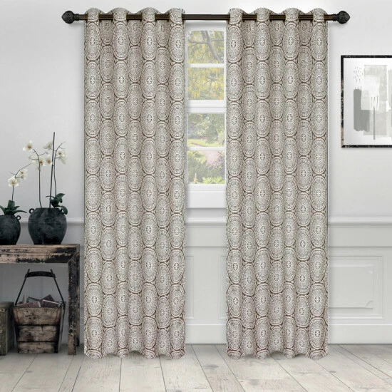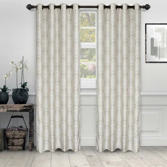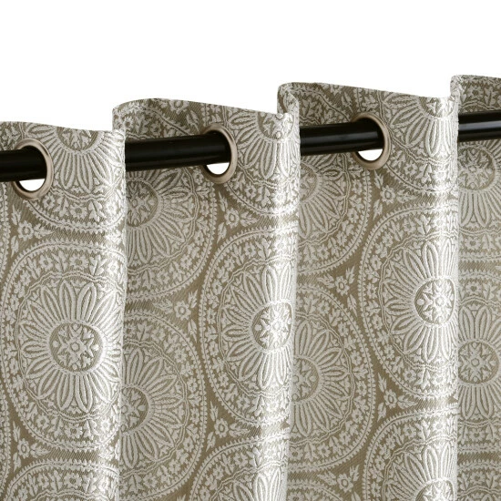Add an opulent update to your windows with the Varnie Jacquard Curtain Set. These glamorous panels feature a regal, woven floral medallion pattern with a slight shimmer resting atop a neutral backdrop. The subtle sheen of the design will make these curtains a focal point in any room. Made from quality, 100% polyester and complete with a polished grommet header, this set is modern in design and easy to install; just hang and slide! This beautiful pair will provide privacy in your home while instantly elevating the beauty of your decor.